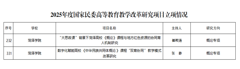 近日,2025年度国家民族事务委员会高等教育教学改革研究项目立项名单正式公布。我校菏泽市统战理论研究基地副秘书长、马克思主义学院崔希涛老师申报课题《“大思政课”背景下菏泽高校<概论>课程与地方红色资源的协同育人机制研究》、张静老师申报课题《数字化赋能高校<中华民族共同体概论>课程“双育协同”教学模式改革研究》获批立项。