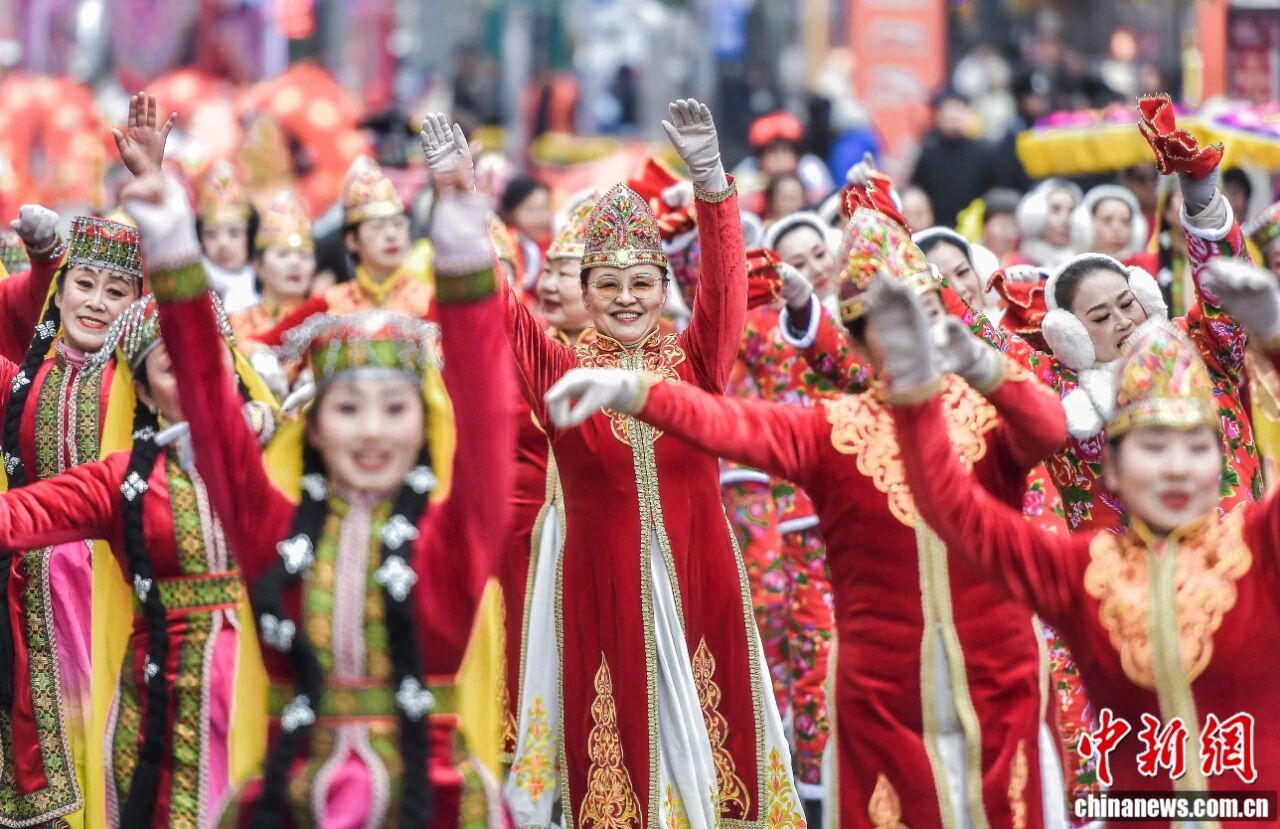 2026年2月5日,新疆乌鲁木齐市闹市区西门老街锣鼓喧天,一场社火展演游街活动在此举行,图为社火队伍的服饰、舞蹈等融入诸多新疆元素。中新社记者 刘新 摄