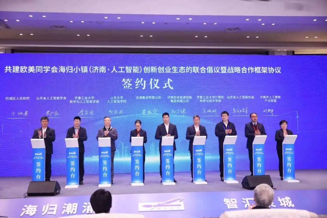 揭牌仪式现场,山东大学人工智能学院、齐鲁工业大学(山东省科学院)计算机科学与技术学部和数学与人工智能学部、浪潮集团有限公司、山东省人工智能协会、山东省人工智能学会、济南财金投资控股集团、济南市人工智能产业联盟、历城区人民政府共同签署助力欧美同学会海归小镇(济南·人工智能)建设战略合作协议。